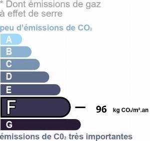 GES : F - 96 kg CO?/m²/an (émissions de gaz à effet de serre)