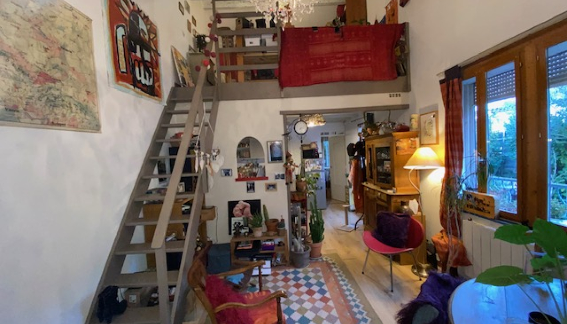 Mezzanine de 20 m², surplombant partiellement le salon, utilisée comme coin télévision, espace lecture et couchage d'appoint.