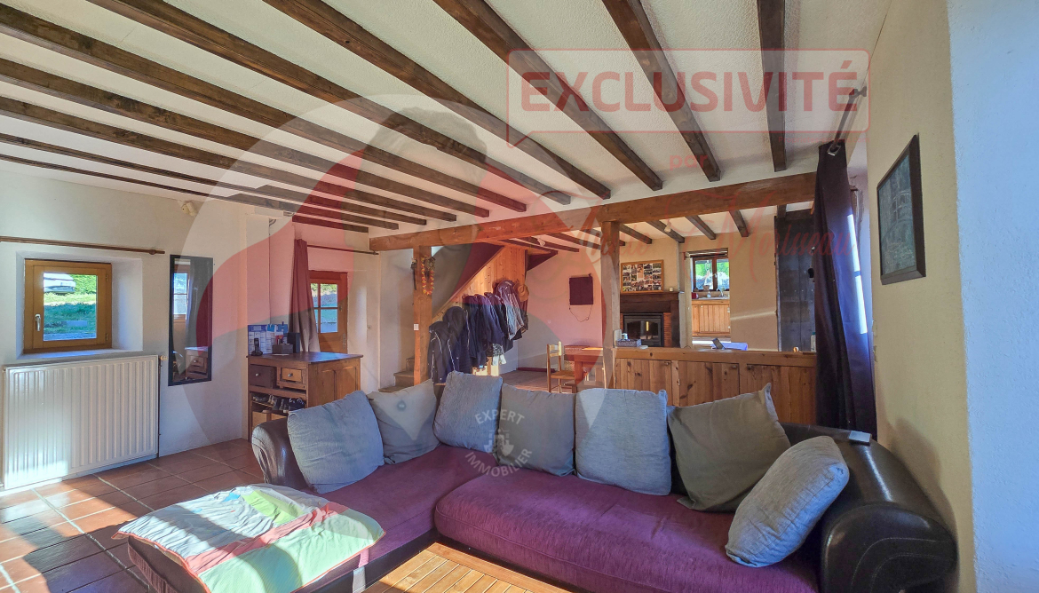 -Une grande pièce de vie de 46 m² avec cheminée à insert, faisant également office d'entrée. Accès de plain-pied à une immense terrasse orientée nord-est, ce qui la met à l'ombre de la maison, l'été.